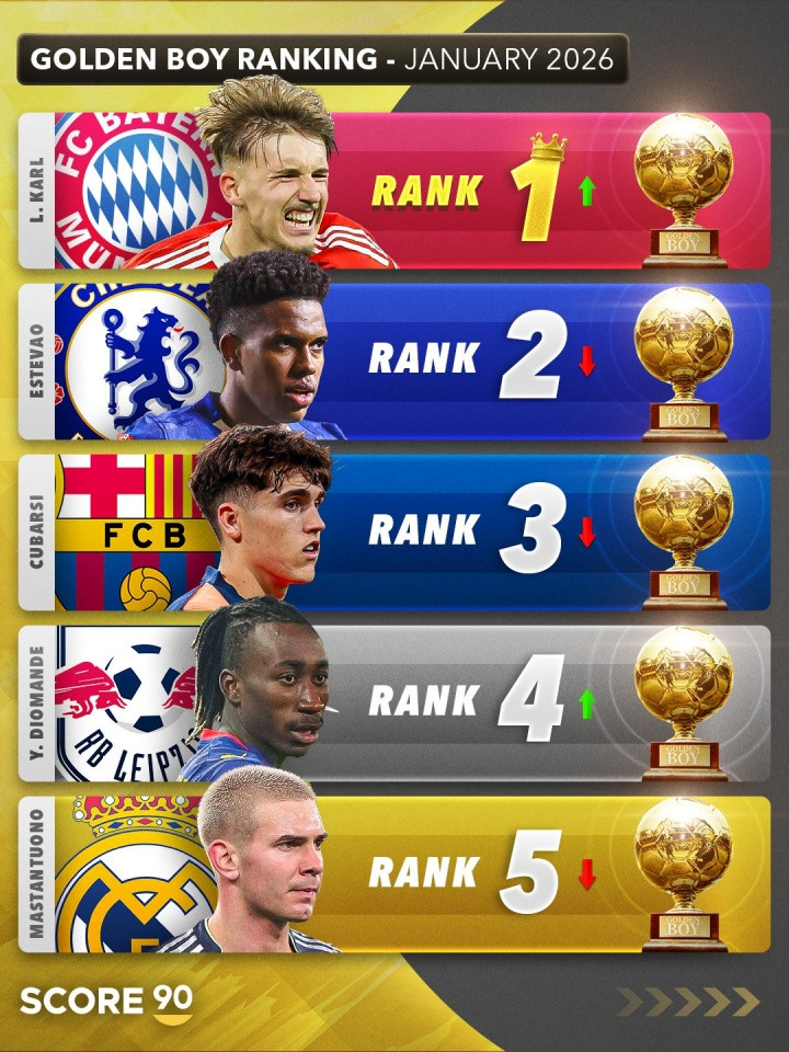直播吧01月31日讯Score90列出了2026年金童奖最新排名预测,卡尔居首,埃斯特旺、库巴西分列二三。其中,拜仁小将卡尔距上次排名上升了两位,来到榜首位置。